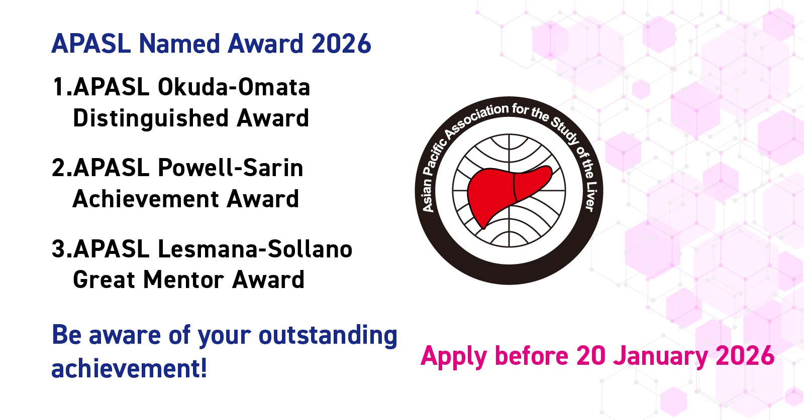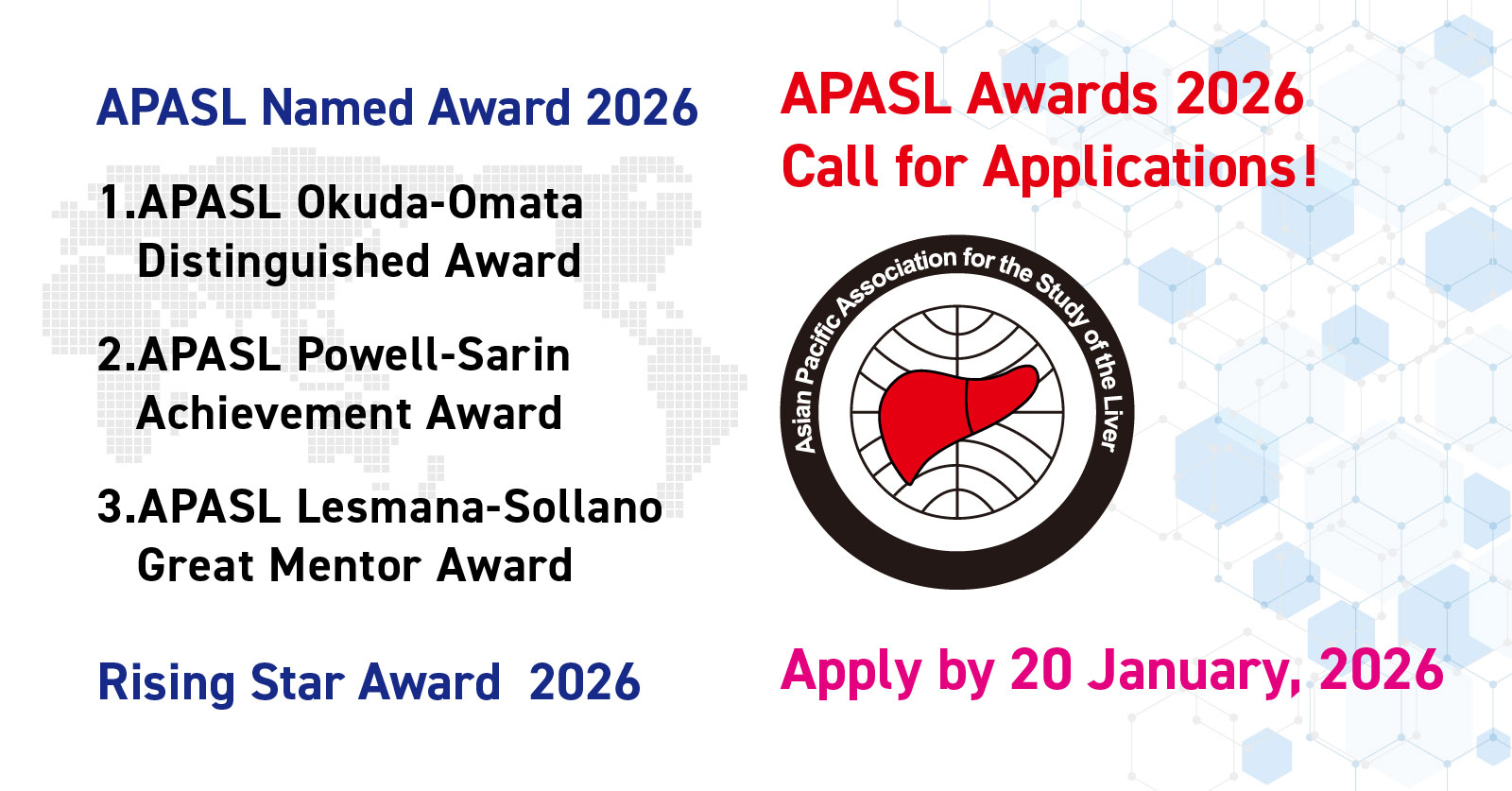 Dear, APASL members It is a great pleasure to announce you that APASL will call for application of the APASL Named Award and Rising Star Award which will be included in the scientific program of the next APASL Annual Meeting. Following is the information regarding the application for the Awards. We are looking forward your application! |
